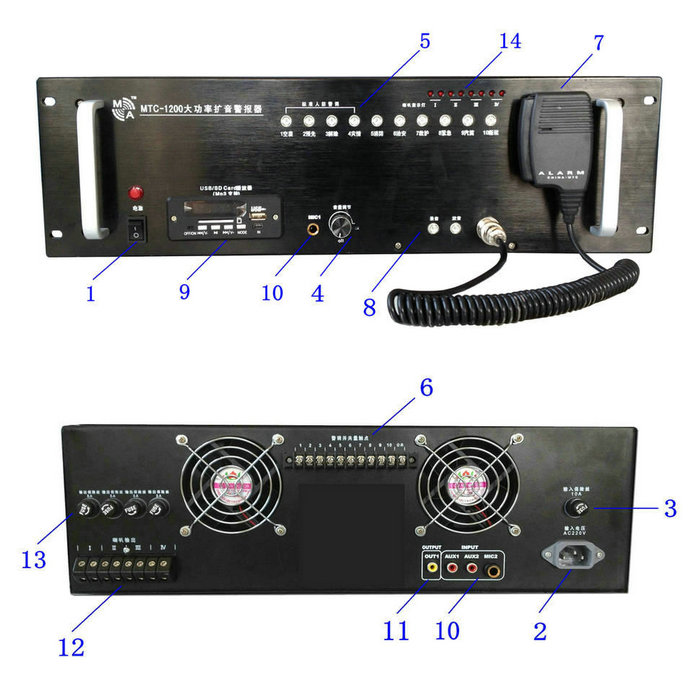 MTC-1200大功率擴音警報器 功放控制主機 (AC220V,1200W,臺式/標準機柜安裝) 1臺;