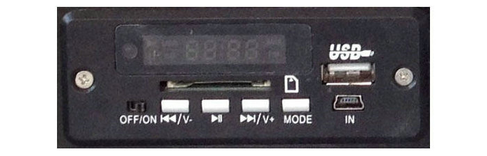 控制面板上‘OFF/ON’撥到ON檔,開啟播放器。按‘MODE’切換U盤和SD卡。將U盤或SD卡插入,播放器自動搜索并播放U盤或SD卡中MP3音頻。按‘?II’播放或暫停。按‘??I’‘I??’前后選擇曲目。